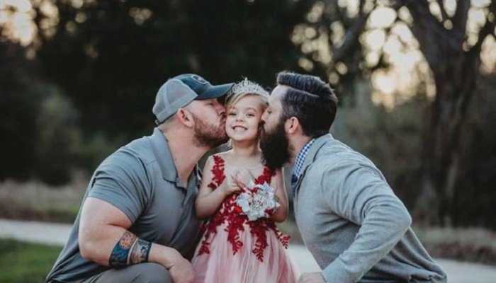 Στη μία εικόνα, οι δύο άντρες φιλούν την κόρη τους. Στην άλλη, την αγκαλιάζουν, πιάνοντας ο ένας τα χέρια του άλλου.