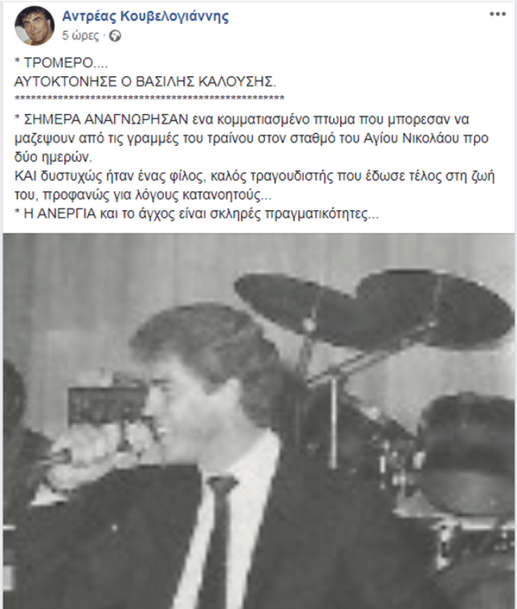 «Τρομερό. Αυτοκτόνησε ο Βασίλης Καλούσης. Σήμερα αναγνώρισαν ένα κομματιασμένο πτώμα που μπόρεσαν να μαζέψουν από τις γραμμές του τραίνου στον σταθμό του Αγίου Νικολάου προ δύο ημερών. ΚΑΙ δυστυχώς ήταν ένας φίλος, καλός τραγουδιστής που έδωσε τέλος στη ζωή του, προφανώς για λόγους κατανοητούς... Η ανεργία και το άγχος είναι σκληρές πραγματικότητες…», γράφει στην ανάρτησή του.