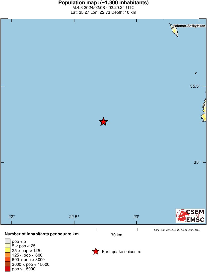 Σεισμός μεγέθους 4,3 βαθμών της κλίμακας Ρίχτερ, σύμφωνα με την αναθεωρημένη λύση του Ευρωπαϊκού – Μεσογειακού Σεισμολογικού Κέντρου (EMSC), σημειώθηκε τα ξημερώματα της Πέμπτης (8/2), στις 04:20, σε υποθαλάσσια περιοχή, δυτικά της Κρήτης.