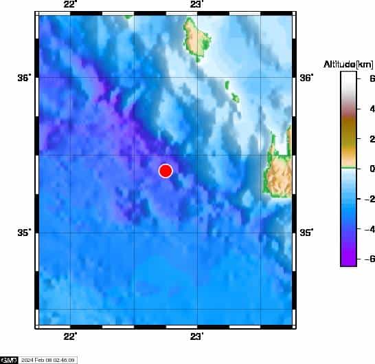 Το ακριβές επίκεντρο τη δόνησης εντοπίζεται στα 87 χλμ. δυτικά – νοτιοδυτικά της Κισσάμου Χανίων.
