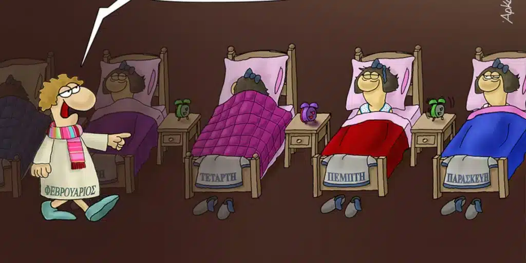 Στο σημερινό του σκίτσο ο Φεβρουάριος ξυπνά την τεμπέλα …Παρασκευή λέγοντας ότι ήρθε η ώρα να σταματήσει η λούφα.
