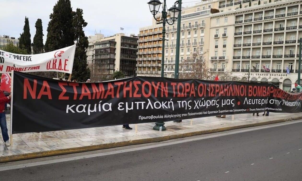 Ένταση επικράτησε νωρίτερα στο Σύνταγμα κατά τη διάρκεια πορείας που έγινε για την Παλαιστίνη. Συγκεκριμένα, σύμφωνα με την ΕΛΑΣ, μικρής έκτασης επεισόδια σημειώθηκαν το μεσημέρι έξω από εστιατόριο στην πλατεία Συντάγματος, το οποίο είχαν αποκλείσει συμβολικά οι διαδηλωτές.
