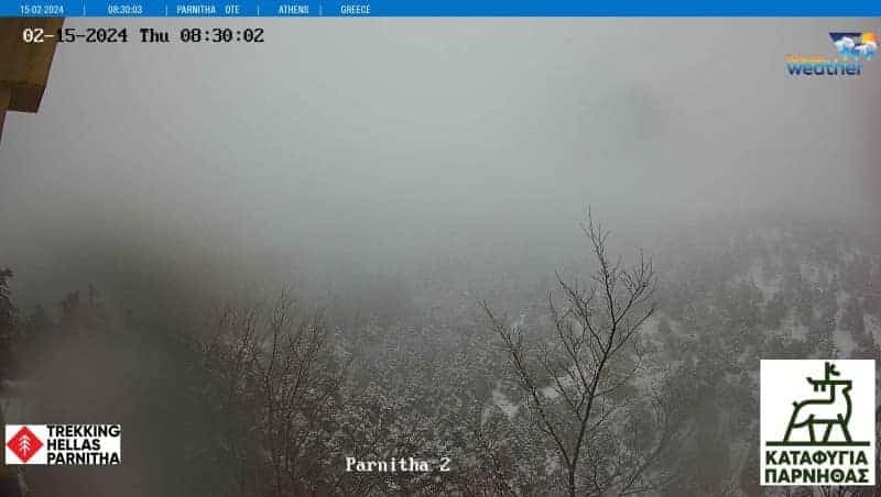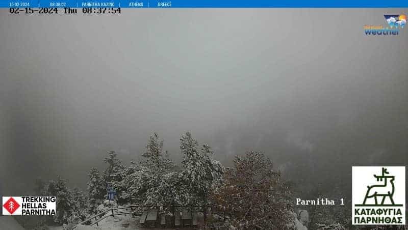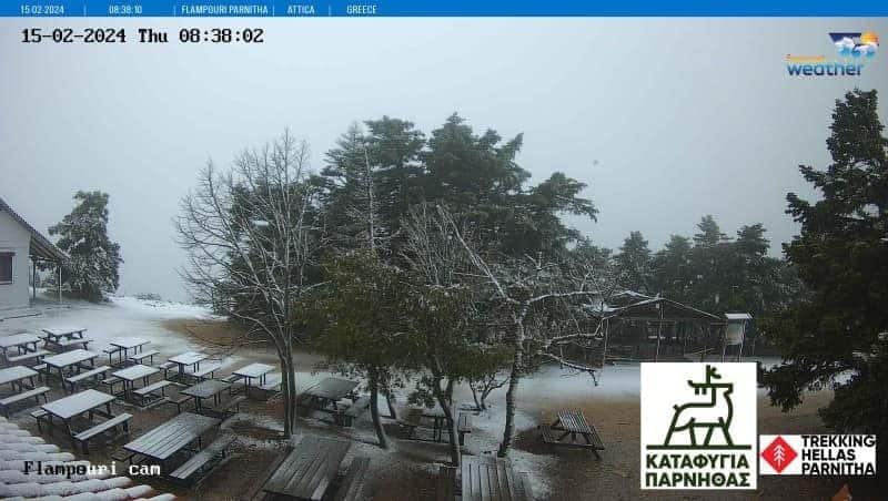 Στα «λευκά» έχει ντυθεί το καταφύγιο Φλαμπούρι της Πάρνηθας, όπως βλέπουμε στις εικόνες που δημοσιεύει του Forecast Weather Greece.