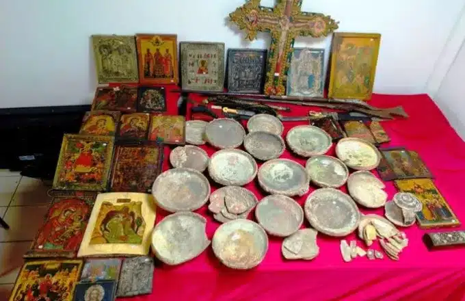 Επίσης εντοπίστηκαν και κατασχέθηκαν 24 θρησκευτικές εικόνες, σταυρός τέμπλου μεταβυζαντινών χρόνων και δύο μεταλλικοί σταυροί, τα οποία σύμφωνα με γνωμάτευση αρμόδιας αρχαιολόγου της Εφορείας Αρχαιοτήτων Θεσσαλονίκης εμπίπτουν στις προστατευτικές διατάξεις του Νόμου που αφορά σε «Κύρωση κώδικα νομοθεσίας για την προστασία των αρχαιοτήτων και εν γένει της πολιτιστικής κληρονομιάς», καθώς και 12 μεταλλικές πόρπες, οκτώ μεταλλικά αντικείμενα, ένα φλουρί και ένα γιαταγάνι, τα οποία είναι λαογραφικού ενδιαφέροντος και θα αποδοθούν στο αρμόδιο μουσείο για εκτίμηση και περαιτέρω διερεύνηση.