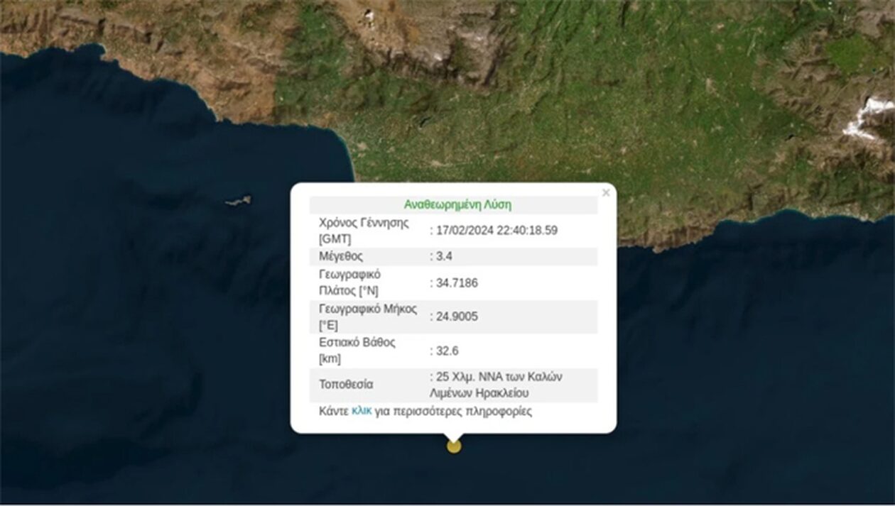 Σεισμική δόνηση 3,4 βαθμών της κλίμακας Ρίχτερ σημειώθηκε τα ξημερώματα της Κυριακής, στις 00:40, ανοιχτά της νότιας Κρήτη.
