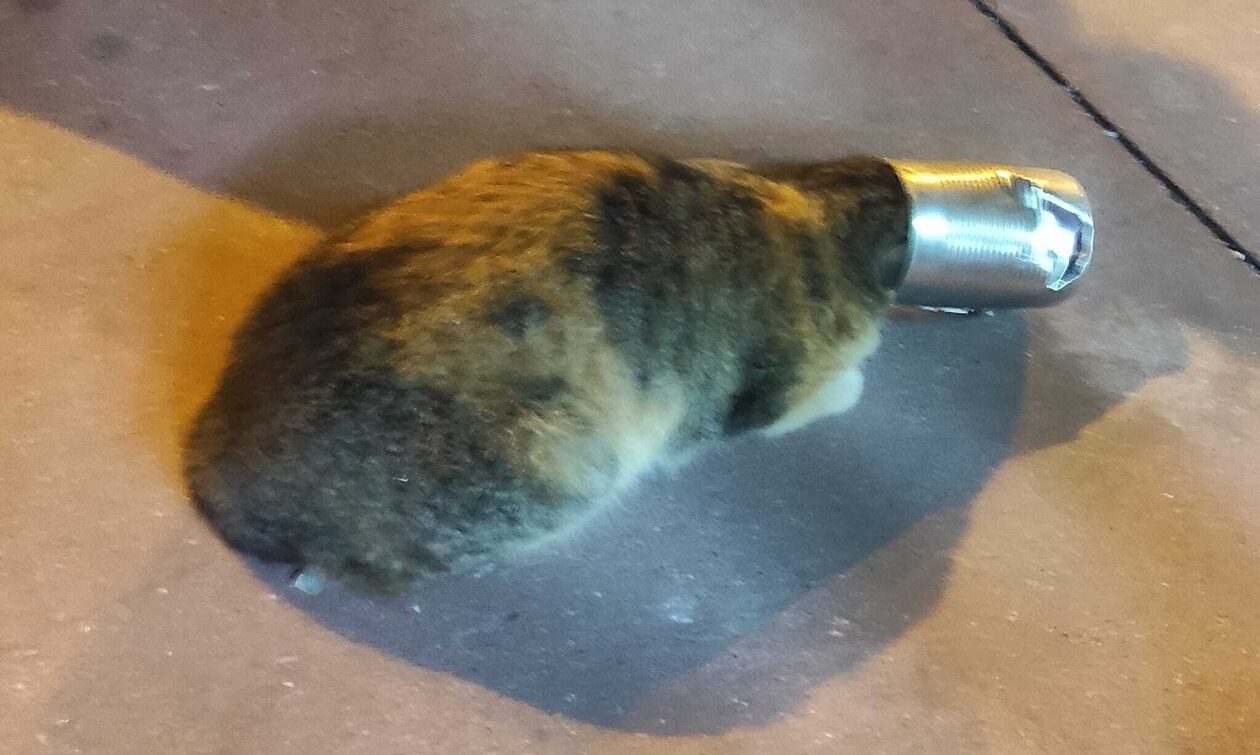 Η Πυροσβεστική δέχθηκε κλήση από πολίτη που ενημέρωσε για μία γάτα, το κεφάλι της οποίας είχε σφηνωθεί σε ένα μεταλλικό κουτί κονσέρβας που πιθανότατα περιείχε τροφή.