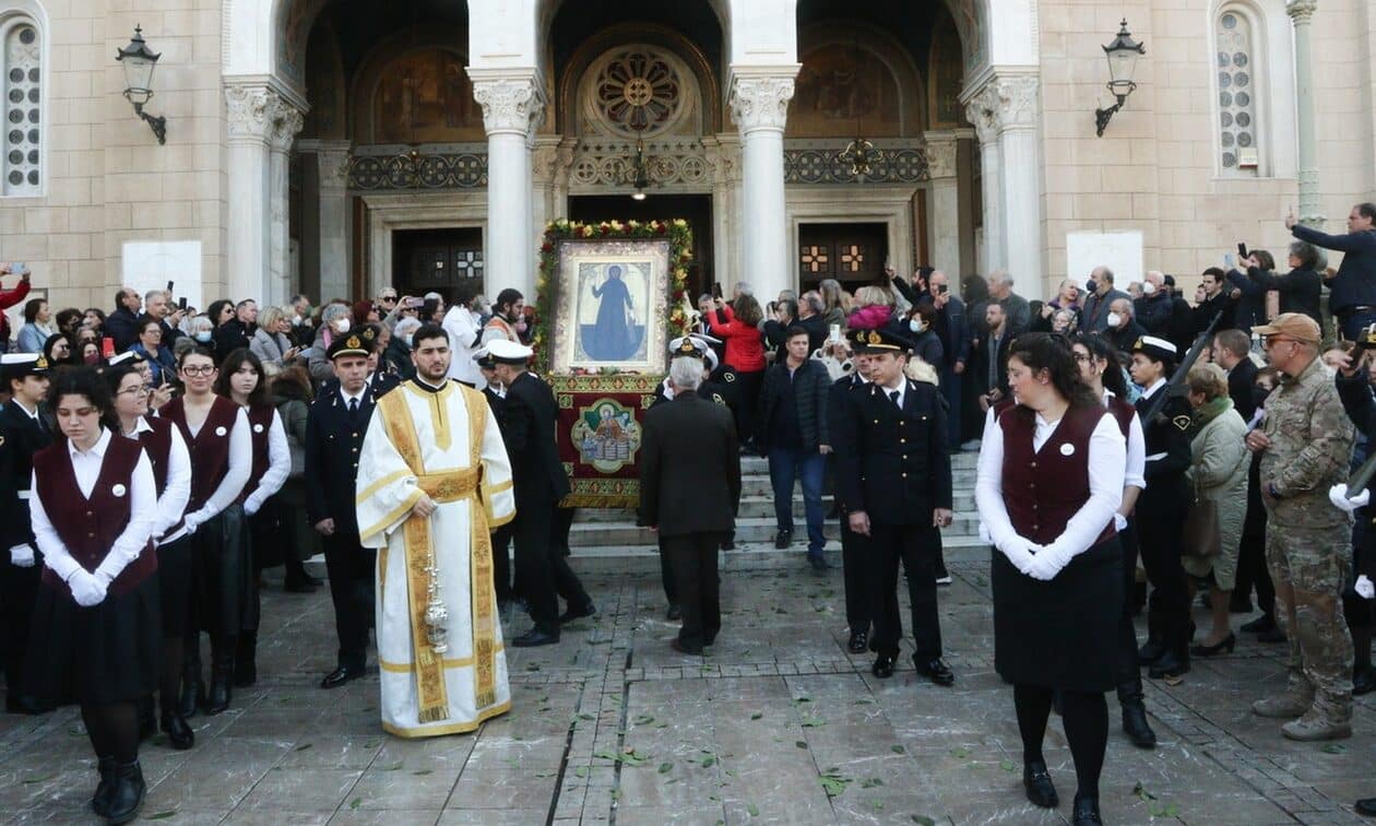 Στη συνέχεια πραγματοποιήθηκε η λιτάνευση του ιερού λειψάνου και της ιεράς εικόνος της Αγίας με τη συνοδεία της φιλαρμονικής του Δήμου Αθηναίων και τιμητικού αγήματος του Λιμενικού Σώματος.