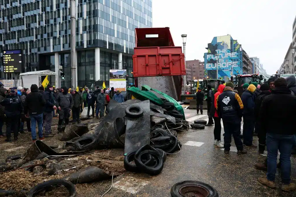 Οι αγρότες έχουν κλείσει δρόμους στο κέντρο των Βρυξελλών με τα τρακτέρ και έχουν στήσει οδοφράγματα με ελαστικά. Παράλληλα με βαριά αγροτικά μηχανήματα σπάνε τα κιγκλιδώματα που έχει τοποθετήσει η αστυνομία στους δρόμους.