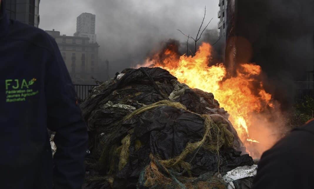 Οι αγρότες άναψαν νέες φωτιές από άχυρα και λάστιχα με την αστυνομία να κάνει ρίψη νερού, ενώ έγινε χρήση δακρυγόνων μετά από ρίψη μπουκαλιών και κονταριών προς αστυνομικούς από τους διαδηλωτές