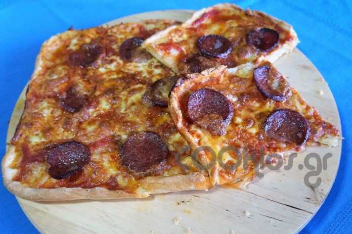Λαδώνουμε ένα ταψί και απλώνουμε τη ζύμη. Ανακατεύουμε την ντομάτα με το αλάτι, την ρίγανη, το πιπέρι και την ζάχαρη και απλώνουμε πάνω στη ζύμη. Προσθέτουμε τη μοτσαρέλα και το σαλάμι και περιχύνουμε με το ελαιόλαδο. Ψήνουμε σε προθερμασμένο φούρνο στους 180οC για 40 λεπτά περίπου, μέχρι να ροδίσει η ζύμη και να ψηθεί καλά. Το τελικό αποτέλεσμα, όπως δηλώνει και το όνομα της συνταγής, έχει αρκετό λάδι. Μπορείτε να μειώσετε λίγο την ποσότητα του λαδιού.