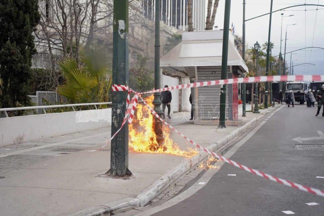 Συγκεκριμένα, μία ομάδα περίπου είκοσι ατόμων με καλυμμένα τα χαρακτηριστικά των προσώπων τους, βγήκε από την πορεία και έριξε μολότοφ στο προαύλιο της Βουλής, ορισμένες από τις οποίες έσκασαν μπροστά από το άγαλμα του Ελευθέριου Βενιζέλου.