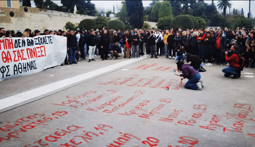 Οι διαδηλωτές που ήταν συγκεντρωμένοι στο Σύνταγμα, λίγο πριν τις 14:00 μετά το μεσημέρι, ξεκίνησαν να γράφουν όλα τα ονόματα των θυμάτων της τραγωδίας με κόκκινη μπογιά.