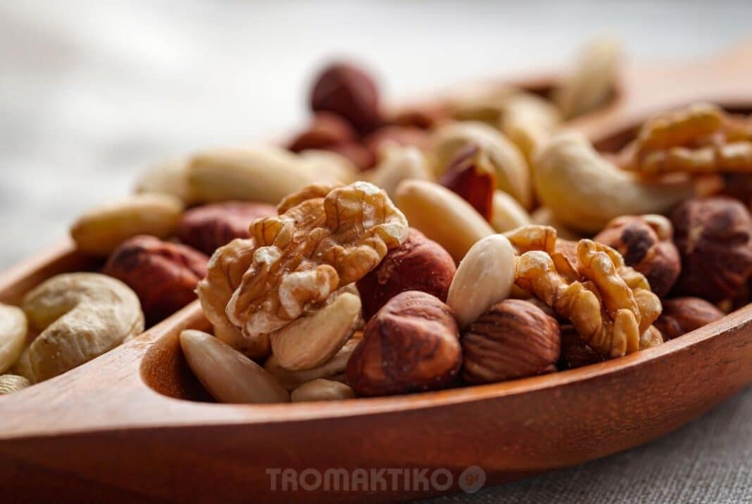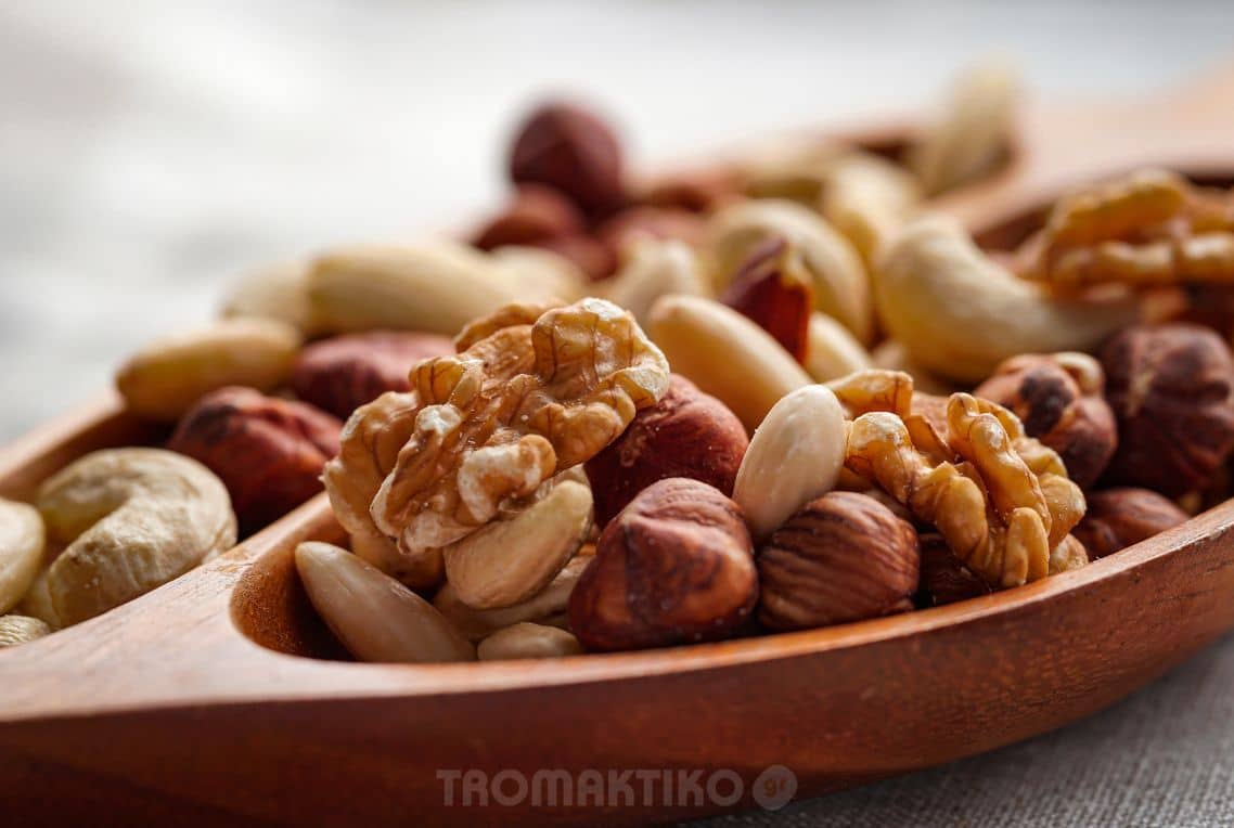 Ξηροί καρποί: Έρευνες έχουν δείξει ότι η κατανάλωση ξηρών καρπών (αμύγδαλα, καρύδια, φιστίκια) ωφελούν την υγεία της καρδιάς. Η κατανάλωση 50 γραμμαρίων ξηρών καρπών καθημερινά, μπορεί να μειώσει την LDL χοληστερόλη, ενώ ειδικά τα καρύδια περιέχουν θρεπτικά συστατικά που προστατεύουν την καρδιά και με άλλους τρόπους.