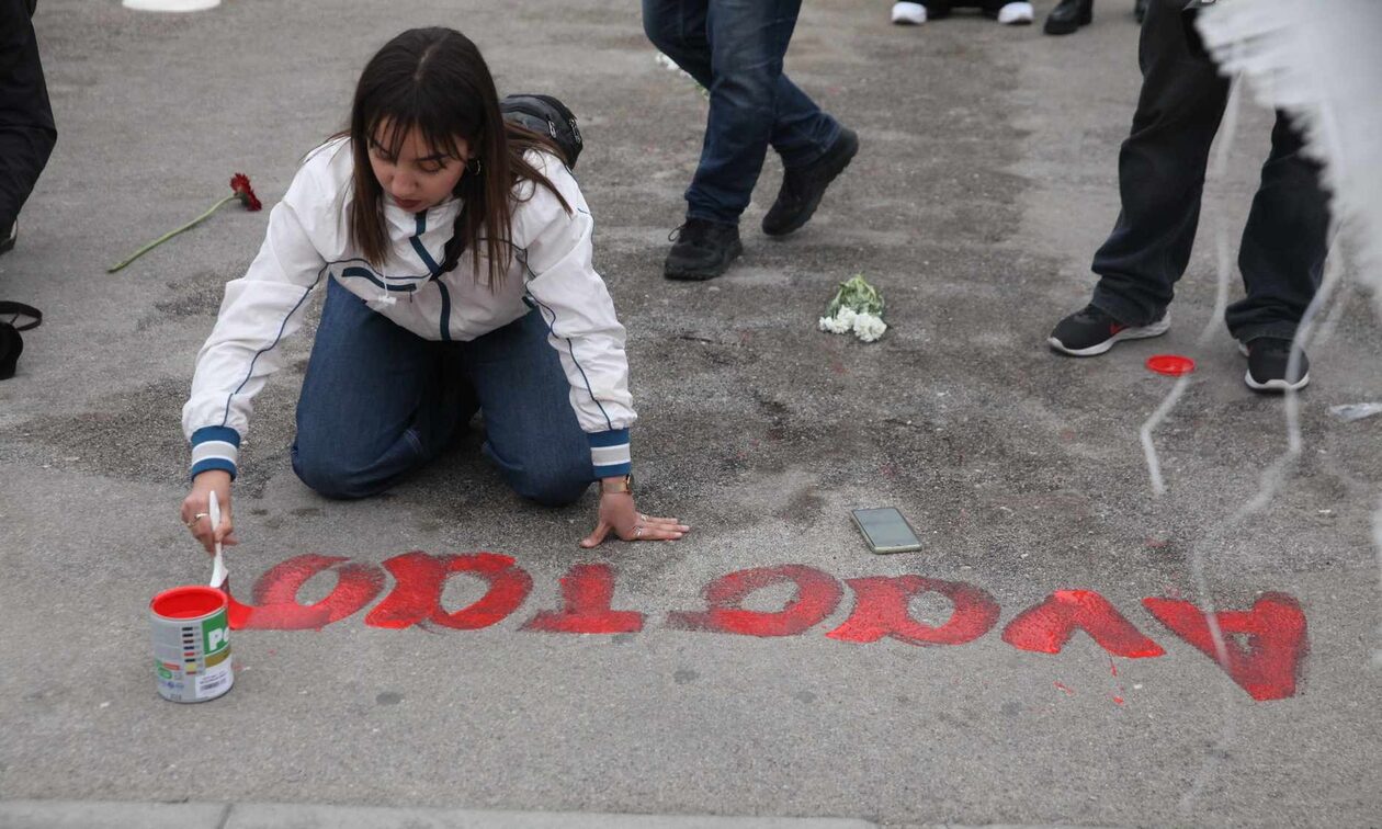 Φοιτητές που βρέθηκαν μπροστά στο μνημείο του Άγνωστου Στρατιώτη πήραν ξανά κόκκινη μπογιά και έγραψαν τα ονόματα των 57 θυμάτων της τραγωδίας στα Τέμπη