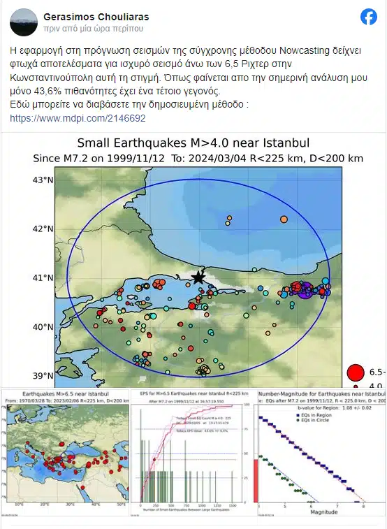 «Η εφαρμογή στη πρόγνωση σεισμών της σύγχρονης μεθόδου Nowcasting δείχνει φτωχά αποτελέσματα για ισχυρό σεισμό άνω των 6,5 Ρίχτερ στην Κωνσταντινούπολη αυτή τη στιγμή. Όπως φαίνεται απο την σημερινή ανάλυση μου μόνο 43,6% πιθανότητες έχει ένα τέτοιο γεγονός».