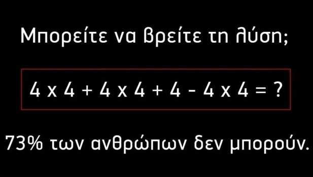 73% των ανθρώπων αδυνατούν να δώσουν λύση σε αυτή την μαθηματική εξίσωση – Εσείς μπορείτε; 10 Ιουλίου 2019 08:49 FacebookTwitterTelegramViberWhatsAppLinkedinEmail Η συγκεκριμένη μαθηματική εξίσωση «4×4+4×4+4-4×4=?» έχει προκαλέσει μια μικρή φρενίτιδα στους χρήστες του facebook εδώ και καιρό. 73% των ανθρώπων αδυνατούν να δώσουν σωστή λύση σε αυτή την μαθηματική εξίσωση. FacebookTwitterTelegramViberWhatsAppLinkedinEmail Προηγούμενο άρθροΗχηρό χαστούκι των ΗΠΑ σε Ερντογάν: Πάρε τώρα το «Γιαβούζ» από την κυπριακή ΑΟΖΕπόμενο άρθροΔεν φαντάζεστε με τι ασχολείται ο Μάκης Παπαδημητρίου εκτός από την υποκριτική (photos) Μπορεί να σας αρέσουν Παράξενα Δείτε εικόνα: Μυστηριώδες κόκκινο φωτοστέφανο στον ουρανό της Ιταλίας – UFO ή κάτι άλλο; 28 Νοεμβρίου 2025 21:27 Παράξενα Δύο καλαμάρια γίγαντες εμφανίστηκαν στη Μύκονο – Δείτε βίντεο 27 Νοεμβρίου 2025 09:39 Παράξενα Αυτό είναι το μεγαλύτερο λαξευμένο διαμάντι του κόσμου – Πωλείται από €12 εκατ. 26 Νοεμβρίου 2025 06:31 4 ΣΧΟΛΙΑ 320 20 320 20 Αφήστε ένα μήνυμα Σχόλιο: εισάγετε το σχόλιό σας! Όνομα: παρακαλώ εισάγετε το όνομά σας εδώ Email: έχετε εισάγει εσφαλμένη διεύθυνση ηλεκτρονικού ταχυδρομείου! παρακαλώ εισάγετε εδώ την ηλεκτρονική σας διεύθυνση Ιστοσελίδα: αποθηκεύστε το όνομα, το ηλεκτρονικό ταχυδρομείο και τον ιστότοπό μου σε αυτό το πρόγραμμα περιήγησης για την επόμενη φορά που θα σχολιάσω.