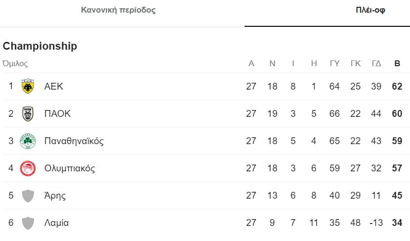 Ο ΠΑΟΚ έμεινε στους 60 και είναι δεύτερος πλέον πίσω από την ΑΕΚ που έχει 62, ενώ ο Άρης είναι πέμπτος με 45 βαθμούς, μακριά από τον τέταρτο Ολυμπιακό αλλά και την έκτη Λαμία.