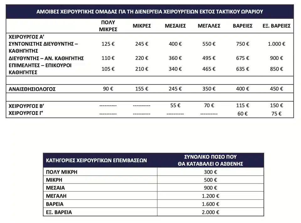 Αναλυτικά, οι αμοιβές για τη χειρουργική ομάδα ανά περίπτωση είναι οι εξής: