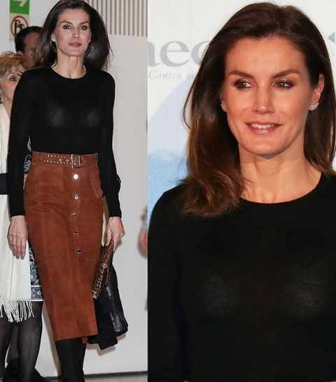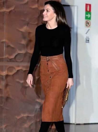 Η βασίλισσα Λετίσια της Ισπανίας φόρεσε χθες μια καφέ σουέντ φούστα με ένα μαύρο μακρυμάνικο μπλουζάκι.