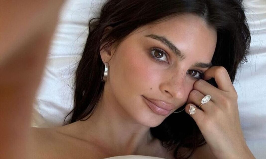 Η Έμιλι Ραταϊκόφσκι πόζαρε ξαπλωμένη σε λευκά σατέν σεντόνια και έδειξε τα δαχτυλίδια της, έχοντας καλύψει το στήθος της