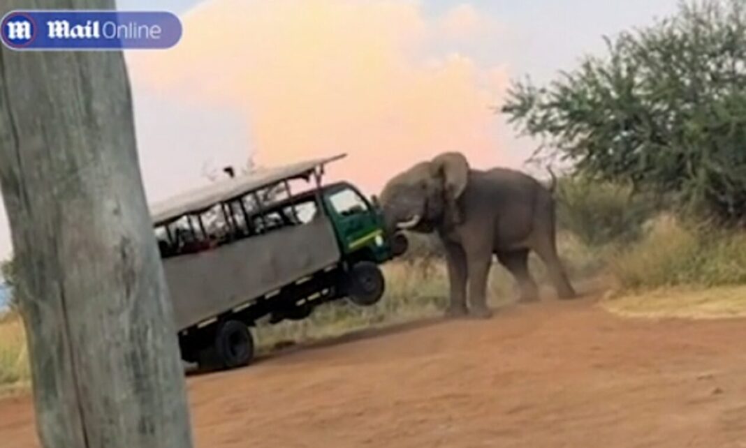 Στο Εθνικό Πάρκο Pilanesberg, κοντά στο Γιοχάνεσμπουργκ της Νότιας Αφρικής, ένας ελέφαντας έκανε μια εκπληκτική επίδειξη δύναμης και επιθετικότητας προς μια ομάδα τουριστών.