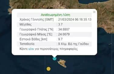 Όπως ανακοίνωσε το Γεωδυναμικό Ινστιτούτο του Εθνικού Αστεροσκοπείου Αθηνών, σεισμός της τάξης των 3,7 Ρίχτερ καταγράφηκε στη Γαύδο στις 8:16 π.μ.
