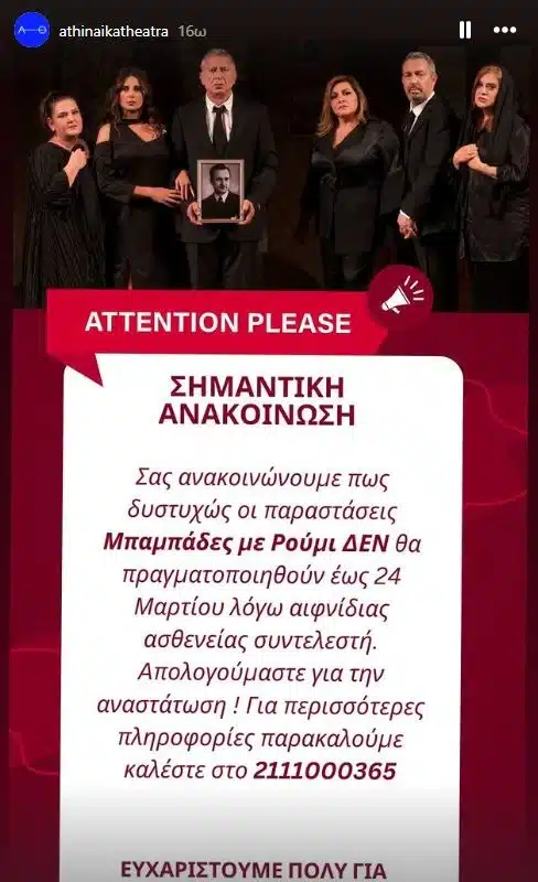 «Σας ανακοινώνουμε πως δυστυχώς οι παραστάσεις «Μπαμπάδες με ρούμι» δεν θα πραγματοποιηθούν έως 24 Μαρτίου λόγω αιφνίδιας ασθένειας συντελεστή. Θα ακολουθήσει νέα ενημέρωση για την επανέναρξη των παραστάσεων. Απολογούμαστε για την αναστάτωση. Ευχαριστούμε πολύ για την κατανόηση».