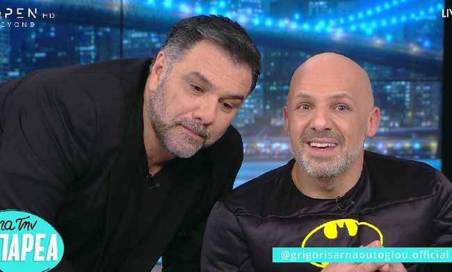 Ο Γρηγόρης Αρναούτογλου προκάλεσε τον Νίκο Μουτσινά να ντυθεί σούπερ ήρωας και την μπάντα που πέρυσι ήταν στην δική του εκπομπή… στρουμφάκια. Εκείνοι αποδέχτηκαν την πρόκληση και ο Γρηγόρης μπήκε στο πλατό με ανεβασμένη διάθεση και δεν σταμάτησε στιγμή να πειράζει τον οικοδεσπότη.