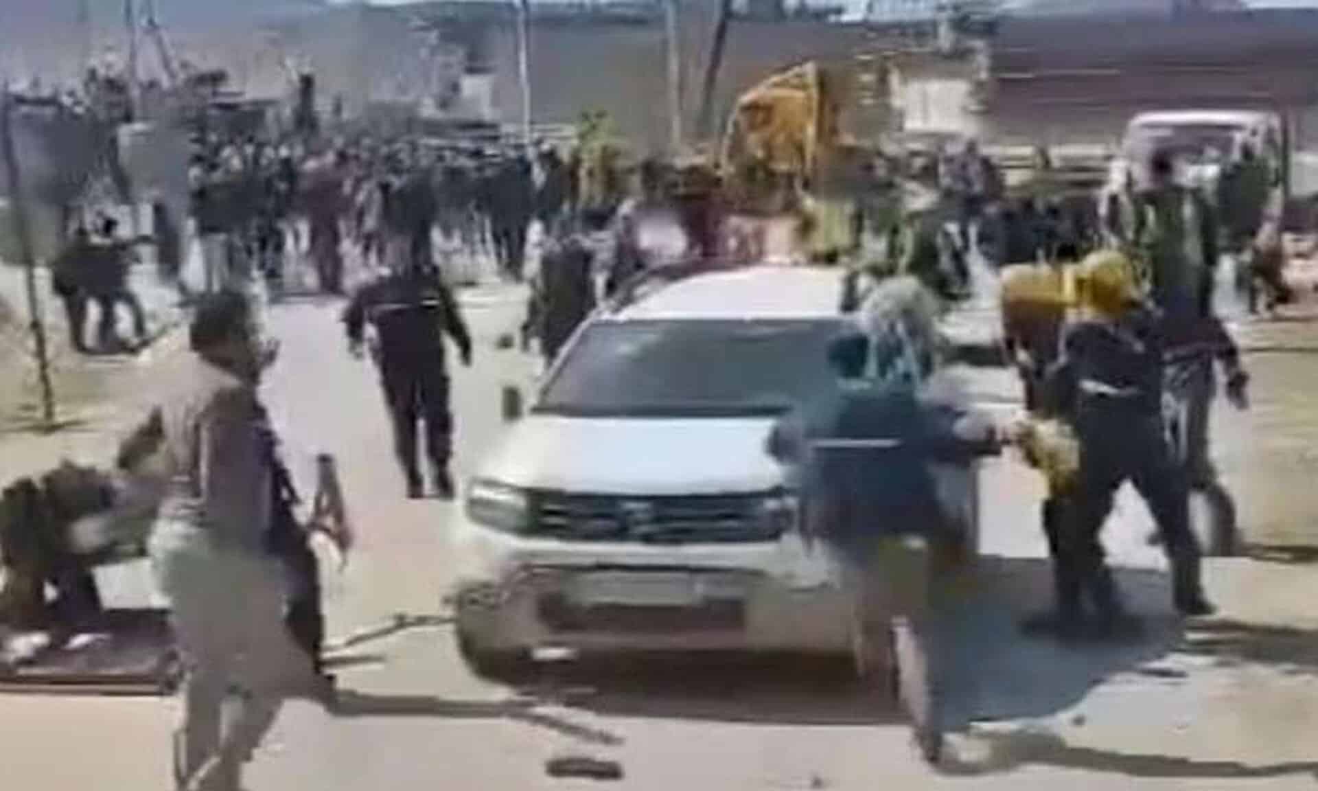 Σε βίντεο φάνηκε ότι εργάτες έκλεισαν τον δρόμο και επιτέθηκαν σε μερικά οχήματα.