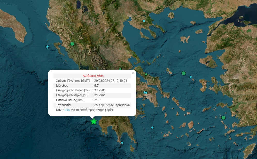Το ακριβές επίκεντρο εντοπίζεται 25 χιλιόμετρα ανατολικά των Στροφάδων.