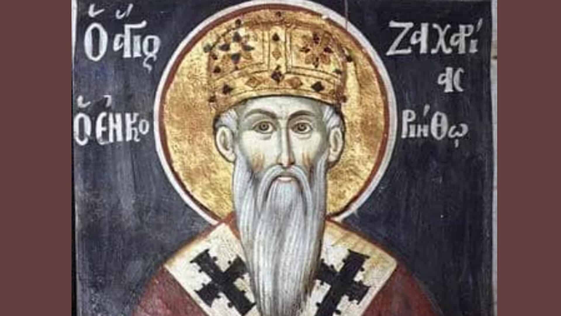 Ο Άγιος Ζαχαρίας ήταν Επίσκοπος Κορίνθου και συκοφαντήθηκε από τους Τούρκους ότι συνεργαζόταν με τους Ενετούς, κατά την εκστρατεία του Μοροζίνη στην Ελλάδα, για την απελευθέρωση των Ελλήνων. Συνελήφθη και αφού βασανίστηκε σκληρά οδηγήθηκε στον κριτή, ο οποίος τον προέτρεψε να αρνηθεί τον Χριστό και να γίνει μουσουλμάνος. Ο Ζαχαρίας, με αηδία άκουσε την πρόταση αυτή του κριτή και γι’ αυτό βασανίστηκε φρικτά. Καταδικάστηκε να καεί ζωντανός στη φωτιά περιστρεφόμενος! Οι χριστιανοί της Κορίνθου κατόρθωσαν, αφού πρόσφεραν μεγάλο χρηματικό ποσό στον Τούρκο έπαρχο, να μεταβληθεί ο φρικτός αυτός τρόπος της θανατικής καταδίκης. Έτσι ο νέος ιερομάρτυρας Ζαχαρίας αποκεφαλίστηκε στην Κόρινθο, 30 Μαρτίου 1684 μ.Χ., Κυριακή της Σταυροπροσκύνησης.