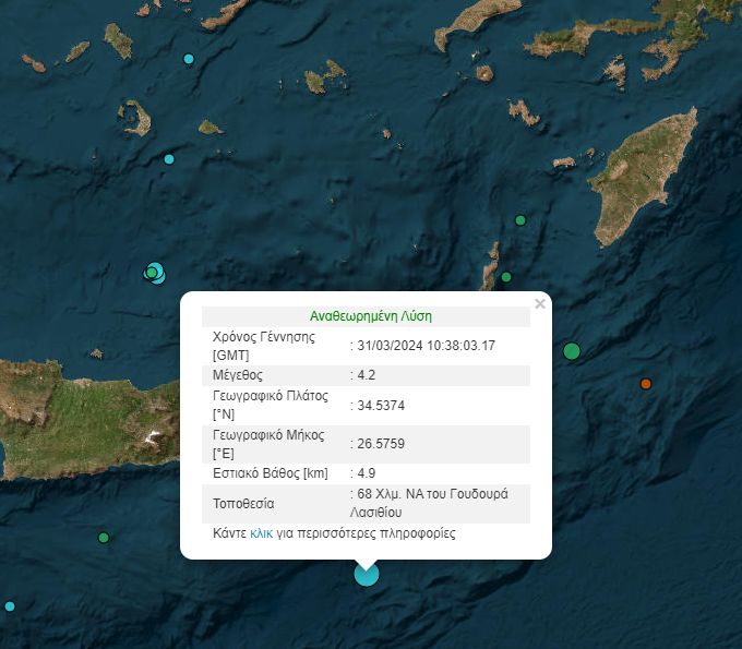 Σεισμός 4,2 Ρίχτερ στην Κάρπαθο 31 Μαρτίου 2024 13:49 FacebookTwitterTelegramViberWhatsAppLinkedinEmail Σεισμός μεγέθους 4,2 Ρίχτερ σημειώθηκε το μεσημέρι της Κυριακής στην Κάρπαθο. Σύμφωνα με το Γεωδυναμικό Ινστιτούτο, η δόνηση σημειώθηκε 68 χιλιόμετρα νοτιοανατολικά του Λασιθίου ενώ το εστιακό βάθος εντοπίζεται στα 4,9 χιλιόμετρα. Πηγή FacebookTwitterTelegramViberWhatsAppLinkedinEmail Προηγούμενο άρθρο«Αντιτρομοκρατική επιχείρηση» στο Νταγκεστάν πραγματοποίησε η Ρωσία – 3 συλλήψειςΕπόμενο άρθροΜέλη του Ρουβίκωνα εισέβαλαν στη Βουλή και το Προεδρικό Μέγαρο – Άνοιξαν πανό για τα Τέμπη Μπορεί να σας αρέσουν Ελλάδα Αγρίνιο: Έκαναν bullying σε 13χρονη συμμαθήτριά τους – Συνελήφθησαν 3 μαθήτριες γυμνασίου 5 Δεκεμβρίου 2025 11:55 Ελλάδα Πόλεις χωρίς εμπόδια: Πώς η τεχνολογία ενισχύει την καθημερινότητα των ατόμων με αναπηρία 5 Δεκεμβρίου 2025 11:03 Ελλάδα Κακοκαιρία Byron: Κλειστοί δρόμοι αυτή την ώρα στην Αττική 5 Δεκεμβρίου 2025 10:59 Αφήστε ένα μήνυμα Σχόλιο: εισάγετε το σχόλιό σας! Όνομα: παρακαλώ εισάγετε το όνομά σας εδώ Email: έχετε εισάγει εσφαλμένη διεύθυνση ηλεκτρονικού ταχυδρομείου! παρακαλώ εισάγετε εδώ την ηλεκτρονική σας διεύθυνση Ιστοσελίδα: αποθηκεύστε το όνομα, το ηλεκτρονικό ταχυδρομείο και τον ιστότοπό μου σε αυτό το πρόγραμμα περιήγησης για την επόμενη φορά που θα σχολιάσω.