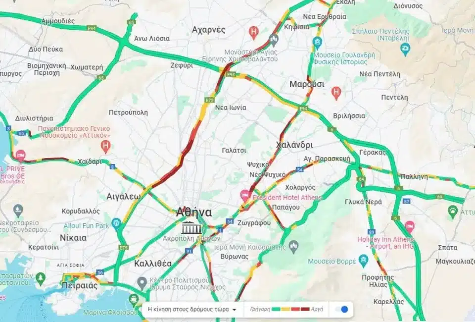 Αυξημένη κίνηση κατά τμήματα και στην κάθοδο Μεσογείων και Κηφισίας, στην ανηφόρα του Καρέα προς Κατεχάκη, στην Κατεχάκη προς Κηφισίας μετά την Αττική Οδό, στους δρόμους προς το λιμάνι του Πειραιά.
