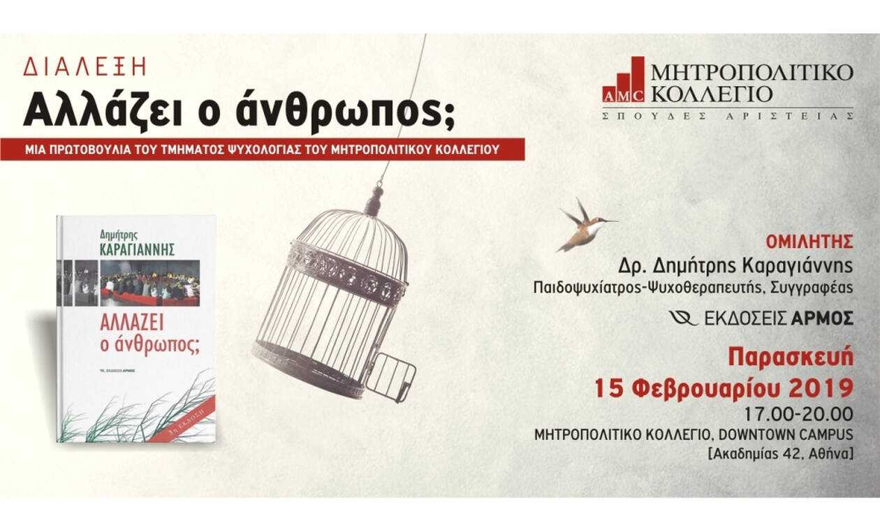 Με πρωτοβουλία του Τμήματος Ψυχολογίας της Σχολής Ανθρωπιστικών Επιστημών του Μητροπολιτικού Κολλεγίου, την Παρασκευή 15 Φεβρουαρίου και ώρες 17:00-20:00, διοργανώνεται διάλεξη με θέμα «Αλλάζει ο άνθρωπος;» στο αμφιθέατρο του Downtown Campus [Ακαδημίας 42].