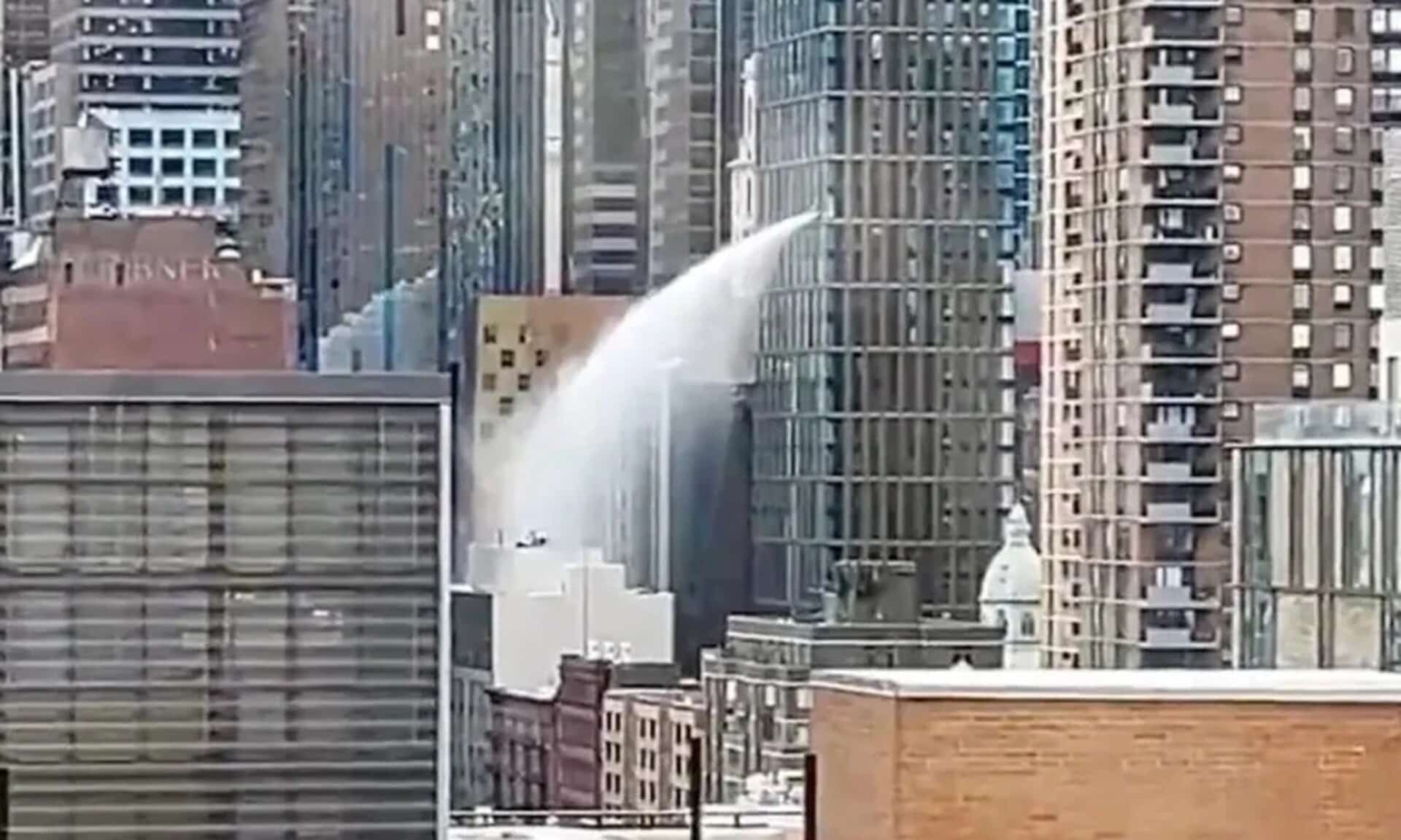 Το νερό πετάγεται δεκάδες μέτρα πάνω από το έδαφος σε ένα κτίριο στη Δυτική 42η οδό και την Όγδοη λεωφόρο πριν πέσει στον δρόμο.