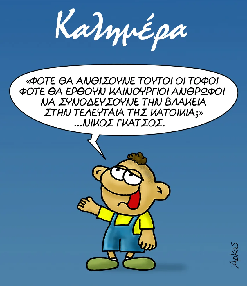 Αρκάς: Με στίχους του Νίκου Γκάτσου μας καλημερίζει σήμερα ο μικρός Θανασάκης. Ο αγαπημένος σκιτσογράφος της καρδιάς μας καυτηριάζει την πολιτική κατάσταση ετών στη χώρα και βάζει στο στόμα του μικρού Θανασάκη τους στίχους του μεγάλου ποιητή Γκάτσου: «Πότε θα ανθίσουμε τούτοι οι τόποι. Πότε θα έρθουν καινούργιοι άνθρωποι να συνοδεύσουν την βλακεία στην τελευταία της κατοικία;»…