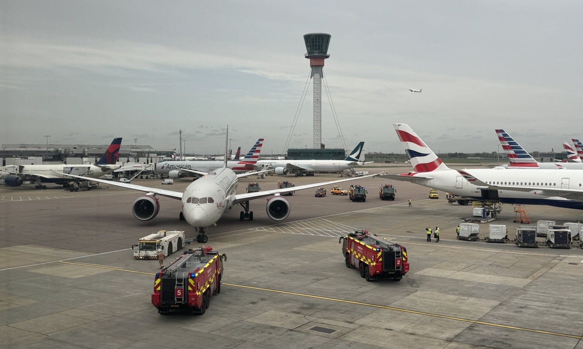 Εικόνες δείχνουν τις υπηρεσίες έκτακτης ανάγκης να σπεύδουν στον τόπο του ατυχήματος στον τροχόδρομο του Χίθροου στον τερματικό σταθμό 3 του αεροδρομίου του δυτικού Λονδίνου.