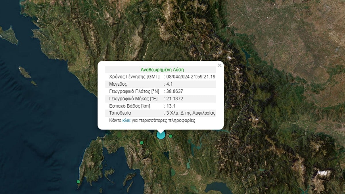 Σεισμός 4,1 βαθμών της κλίμακας Ρίχτερ, σημειώθηκε στις 00:59 στην Αμφιλοχία Αιτωλοακαρνανίας.