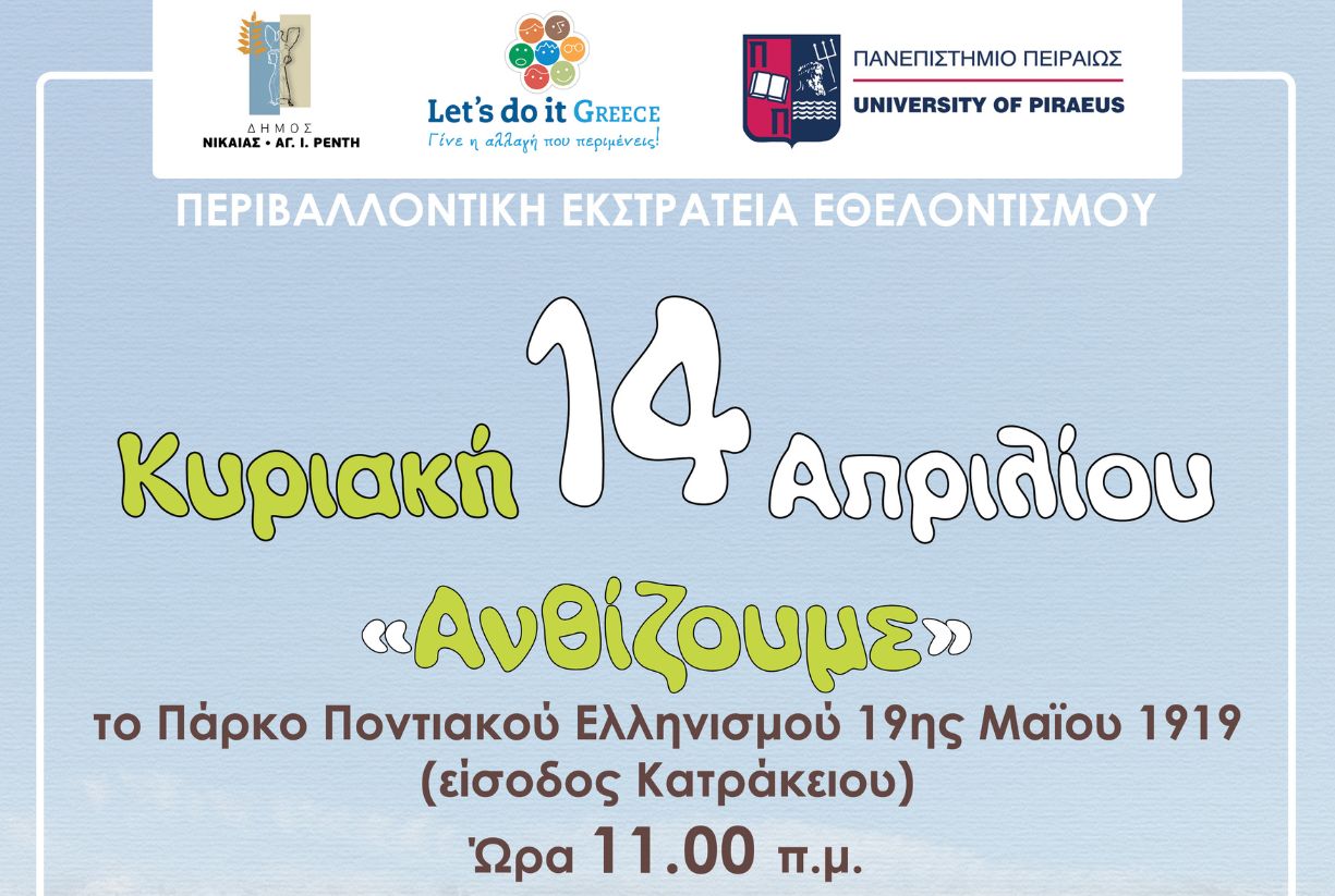 Την Κυριακή 14 Απριλίου από τις 11 το πρωί, ο Δήμος Νίκαιας-Αγ. Ι. Ρέντη και το Πανεπιστήμιο Πειραιώς ενώνουν τις δυνάμεις τους και «ανθίζουν» το Πάρκο Ποντιακού Ελληνισμού 19ης Μαϊου 1919 (είσοδος Κατράκειου).