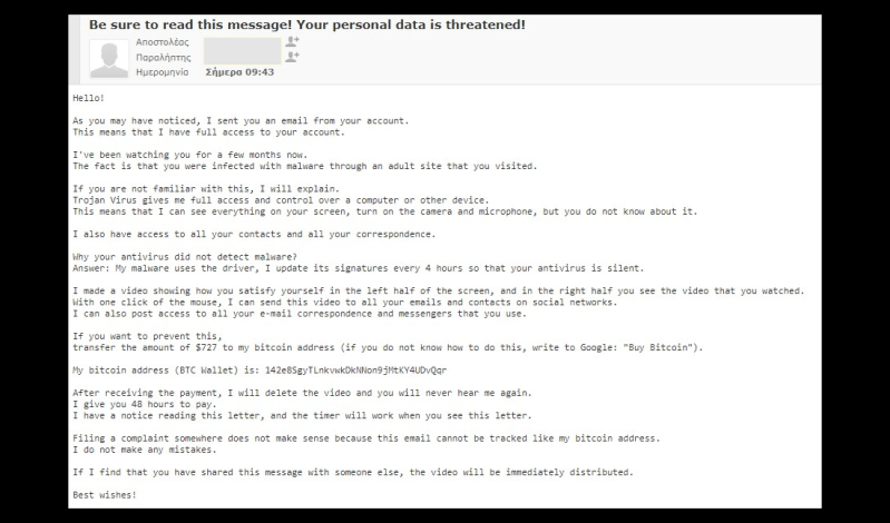 Ακολούθως τον ενημερώνει ότι εγκαταστάθηκε κακόβουλο λογισμικό στον υπολογιστή του με το οποίο είχε πρόσβαση στα αρχεία του και τον απειλεί ότι κατέχει στοιχεία εναντίον του και ζητά μεγάλο χρηματικό ποσό σε bitcoins για να μην τα δημοσιεύσει.