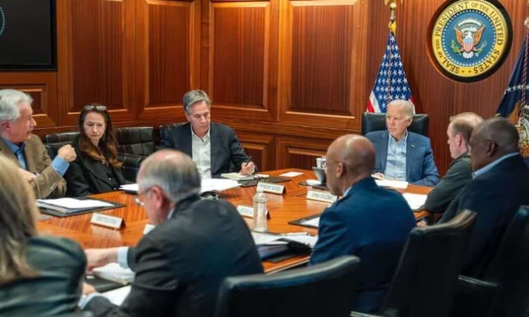 Ο Αμερικανός πρόεδρος Τζο Μπάιντεν, μαζί με μέλη της ομάδας εθνικής ασφαλείας του, την ώρα της κρίσης λάμβαναν ενημερώσεις για τη συνεχιζόμενη αεροπορική επίθεση στο Ισραήλ από το Ιράν, καθώς συναντήθηκαν στο Situation Room του Λευκού Οίκου στην Ουάσιγκτον
