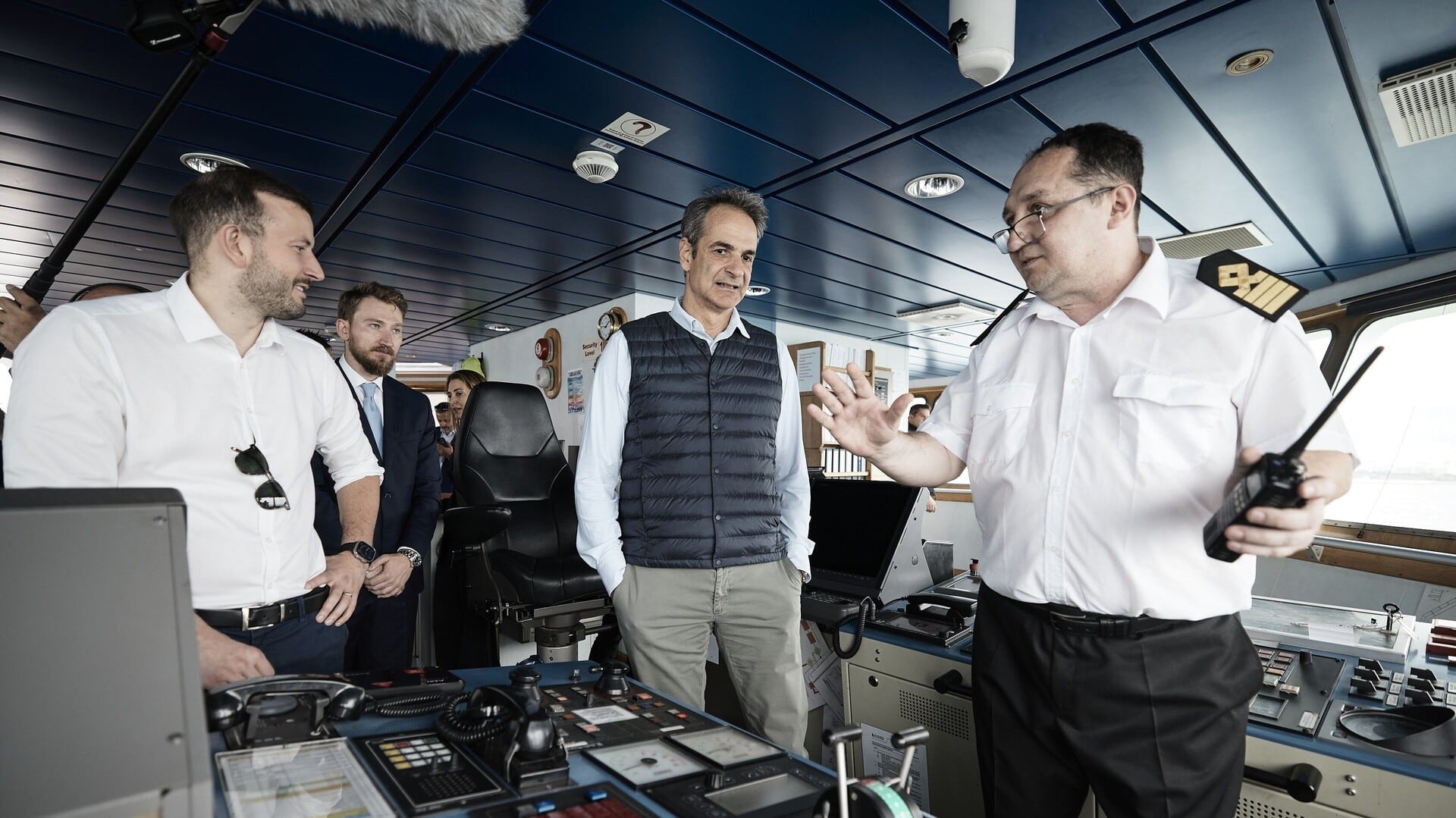 Ο Πρωθυπουργός, συνοδευόμενος από τον Επίτροπο αρμόδιο για το Περιβάλλον, τους Ωκεανούς και την Αλιεία Virginijus Sinkevičius, ξεναγήθηκε στο κατάστρωμα και στη γέφυρα και ενημερώθηκε για τις δυνατότητες του «Typhoon», το οποίο αποτελεί αιχμή του δόρατος του βραβευμένου περιβαλλοντικού προγράμματος «Typhoon Project», του Ιδρύματος Αθανάσιος Κ. Λασκαρίδης.