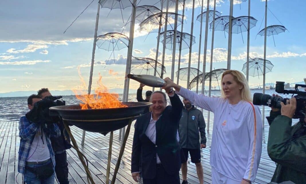 Η λαμπαδηδρόμος και Ολυμπιονίκης, Τασούλα Κελεσίδου, άναψε την Ολυμπιακή Φλόγα μαζί με τον Δήμαρχο Θεσσαλονίκης, Στέλιο Αγγελούδη, δίπλα από τις εμβληματικές Ομπρέλες της Θεσσαλονίκης και με το πλήθος να ξεσπά σε χειροκροτήματα.