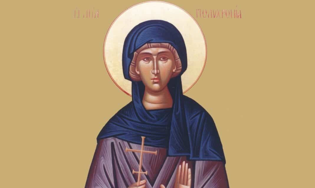 Σύμφωνα με τον συναξαριστή, η Αγία Μάρτυς Πολυχρονία ήταν μητέρα του Αγίου Μεγαλομάρτυρα Γεωργίου του Τροπαιοφόρου και καταγόταν από την πόλη Λύδδα (Διόσπολη) της Παλαιστίνης. Προερχόταν και εκείνη από φημισμένο και αρχοντικό γένος. Ήταν σεμνή και γενναία και πλημμυρισμένη από σωφροσύνη, καλοσύνη και γλυκύτητα. Απ’ όλα πιο πολύ η ψυχή της αγαπούσε τον Θεό, την προσευχή και την ταπείνωση. Ο χρόνος της κυλούσε με την ανάγνωση των Θείων Γραφών και την προσευχή. Τις προσευχές δε και τις αγρυπνίες της, η μακαρία Πολυχρονία, τις συνόδευε με εγκράτεια και νηστεία. Έτσι, αποσπασμένος ο νους της από τη γη υψωνόταν στον ουρανό και βυθιζόταν στη θεωρία του Θεού. Με αυτό τον τρόπο μεταμόρφωνε το γύρω χώρο της και άφηνε να διαχέεται στο ειδωλολατρικό περιβάλλον του συζύγου της Γεροντίου η πάντερπνη οσμή της πνευματικής ευωδίας.