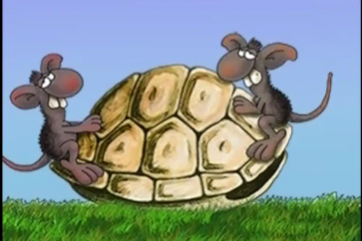 Στο σημερινό σκίτσο του δύο ποντικοί παίζουν τραμπάλα πάνω το καύκαλο της χελώνας και εκείνη διαμαρτύρεται λέγοντας: «Αν βγω έξω θα σας πάρει ο Διάολος τον πατέρα!».