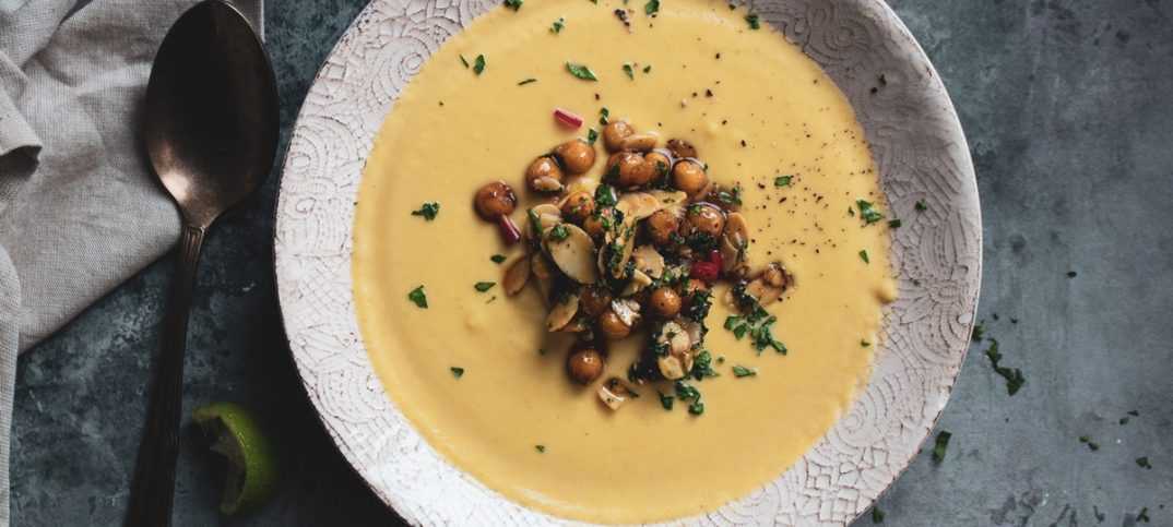 Σερβίρουμε τη σούπα με μερικά καραμελωμένα ρεβύθια, φρέσκο κόλιανδρο και λάιμ.