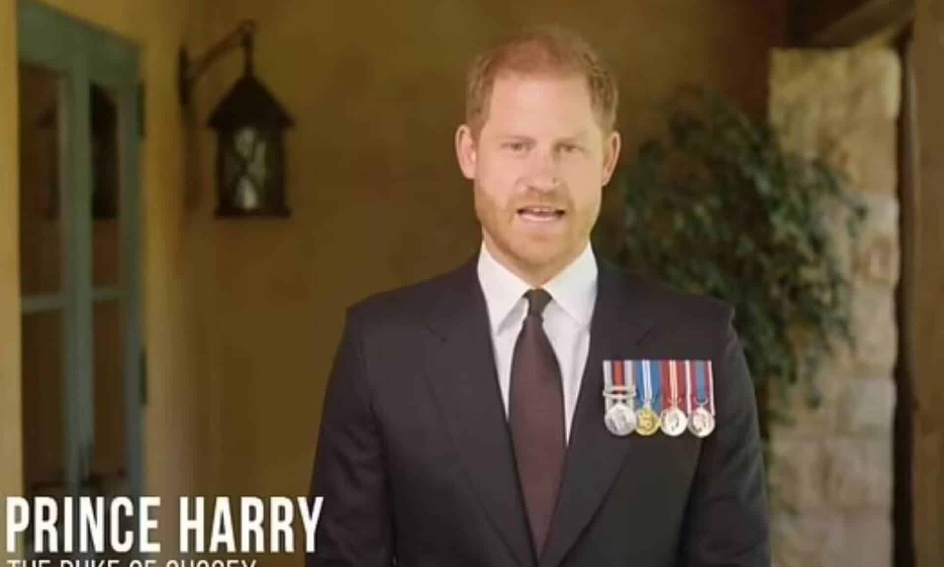 Ο πρίγκιπας Χάρι φόρεσε τα μετάλλιά του για ένα βίντεο το οποίο τραβήχτηκε στην πίσω πόρτα της έπαυλής του στο Μοντεσίτο για να απονείμει το βραβείο του Στρατιώτη της Χρονιάς σε μια ιατρό μάχης των ΗΠΑ.