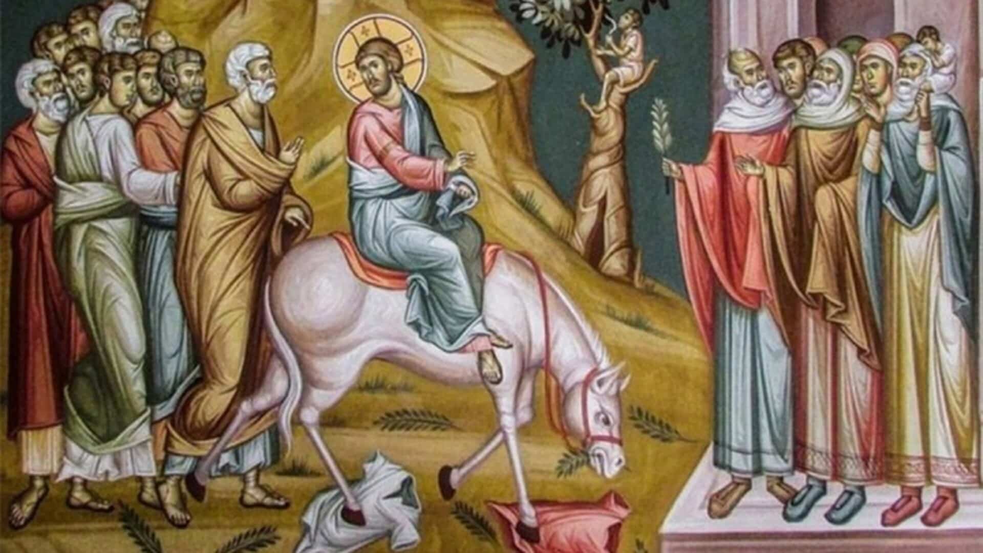Ο Χριστός εισέρχεται στα Ιεροσόλυμα «επί πώλον όνου». Πορεύεται και οι Ισραηλίτες τον υποδέχονται με τιμές ως Βασιλιά. Εκείνος δεν δίνει ιδιαίτερη σημασία στις τιμές, δεν περιορίζεται στο πανηγύρι, στην πρόσκαιρη δόξα, αλλά προχωρεί στο σταυρό και την Ανάσταση.
