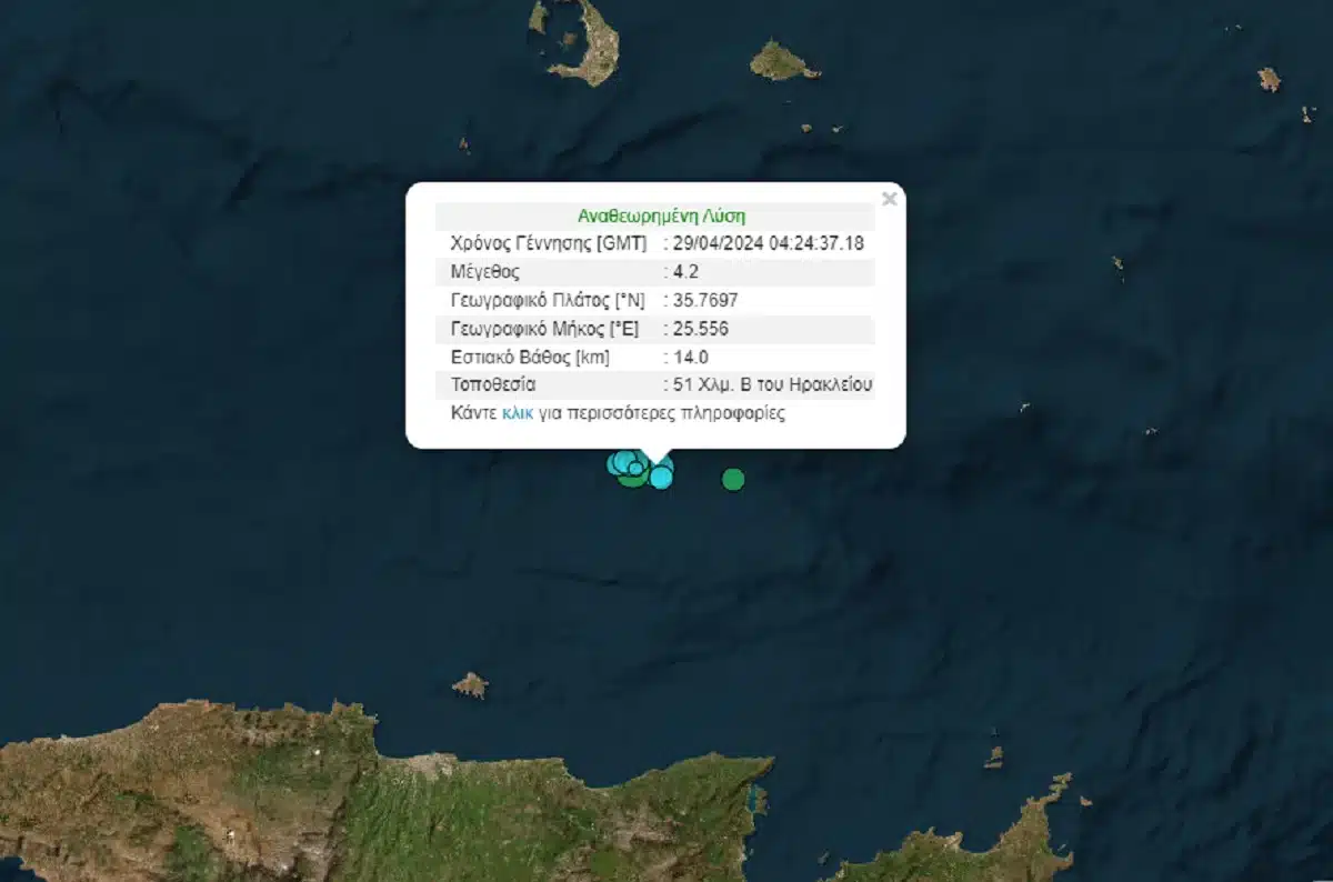 Ειδικότερα ο εν λόγω σεισμός των 4,2 Ρίχτερ σημειώθηκε στις 7:24 το πρωί της Δευτέρας με το επίκεντρό του να εντοπίζεται στα 47χλμ. βόρεια-βορειοανατολικά του Ηρακλείου.