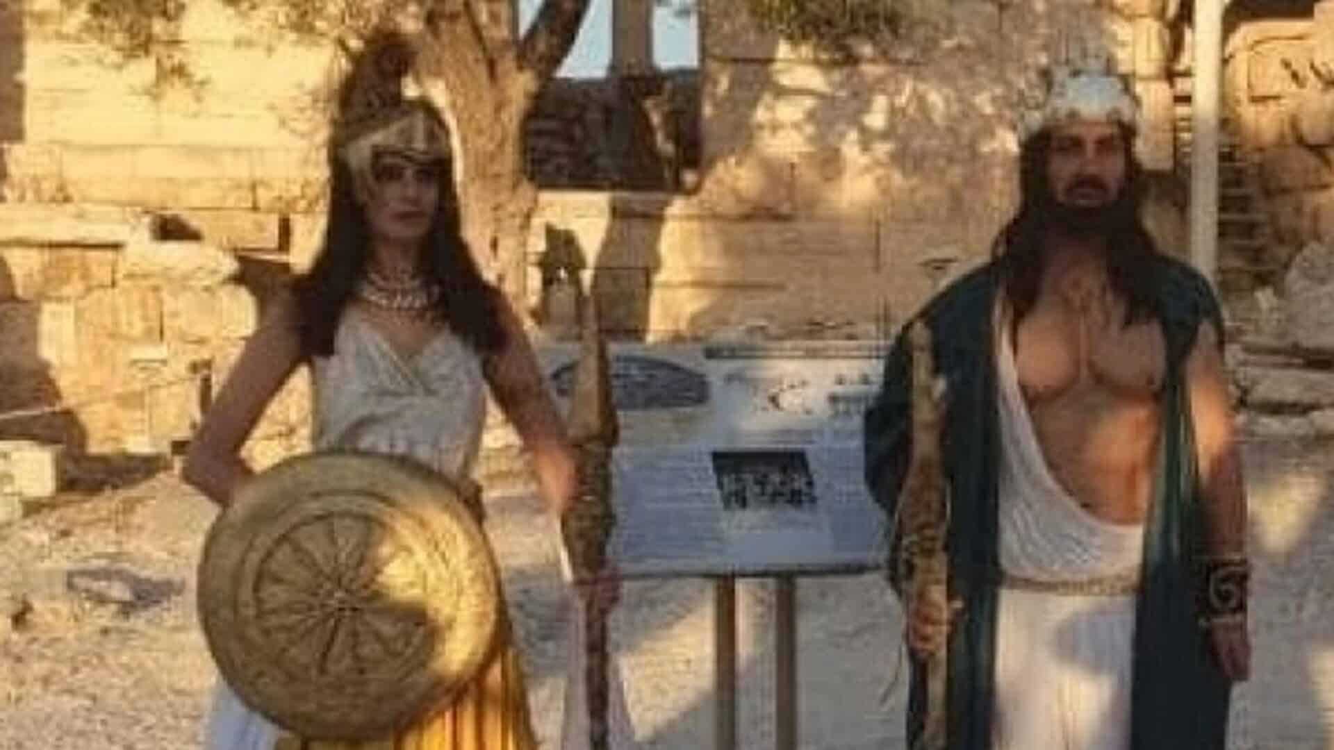 Ντυμένοι με χλαμύδες και κρατώντας περικεφαλαίες και ασπίδες, ενώ είχαν βάψει λευκά τα πρόσωπά τους ποζάρησαν κάποιοι τουρίστες στην Ακρόπολη